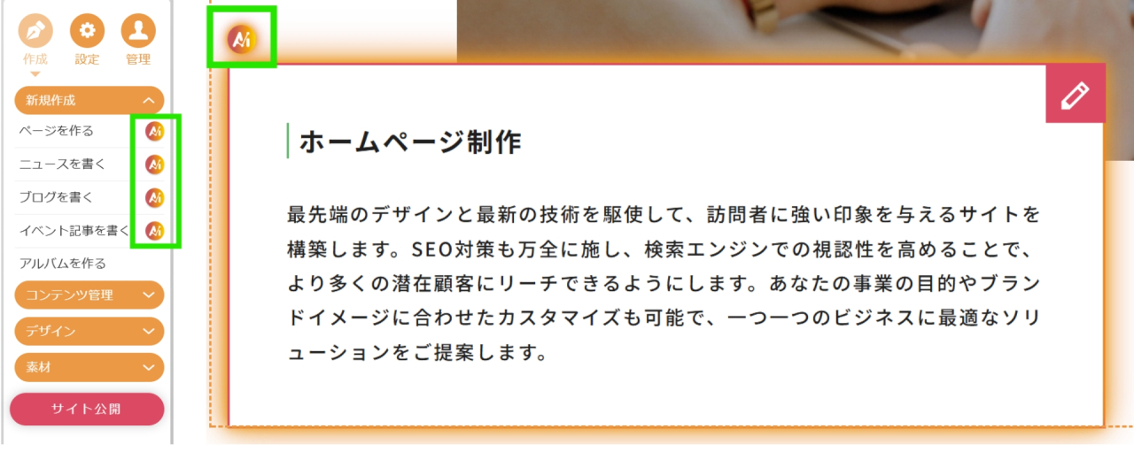 ページ作成・ブログ・ニュース・イベントの記事タイトルや概要の生成、ページ内テキストのAI生成や改善、メタタグのタイトルタグやメタディスクリプションの作成、さらに既存文の外国語翻訳や、やさしい表現への言い換えにも活用できます。